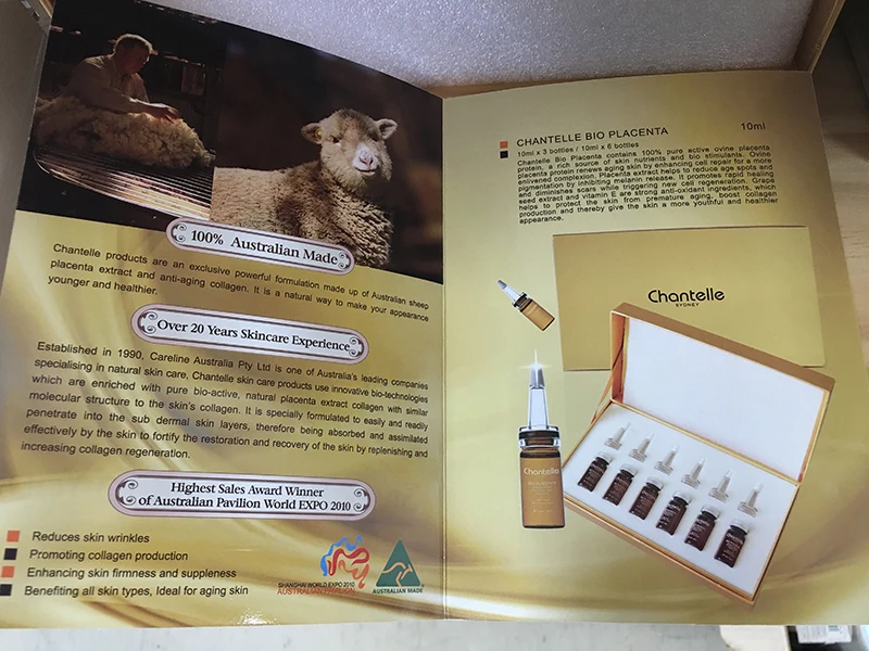 Chantelle GOLD Bio Placenta contains 100% pure active ovine placenta protein, a rich source of skin nutrients and bio stimulants. Ovine placenta protein renews aging skin by enhancing cell repair for a more enlivened complexion. Sheep placenta extract helps to reduce age spots and pigmentation by inhibiting melanin release. It promotes rapid healing and diminishes scars while triggering new cell regeneration. Grape seed and vitamin E are strong anti-oxidant ingredients, which helps protect the skin from premature aging, boost collagen production and thereby give the skin a more youthful and healthier appearance.